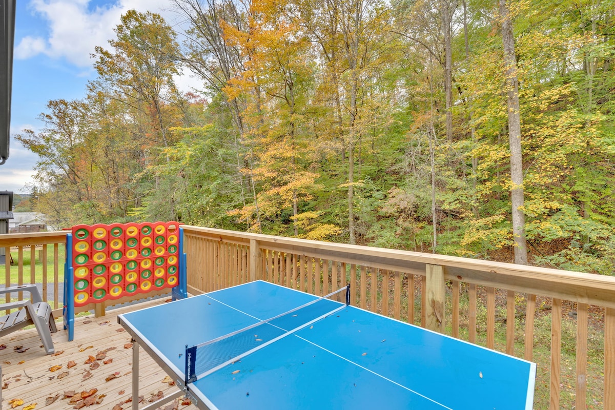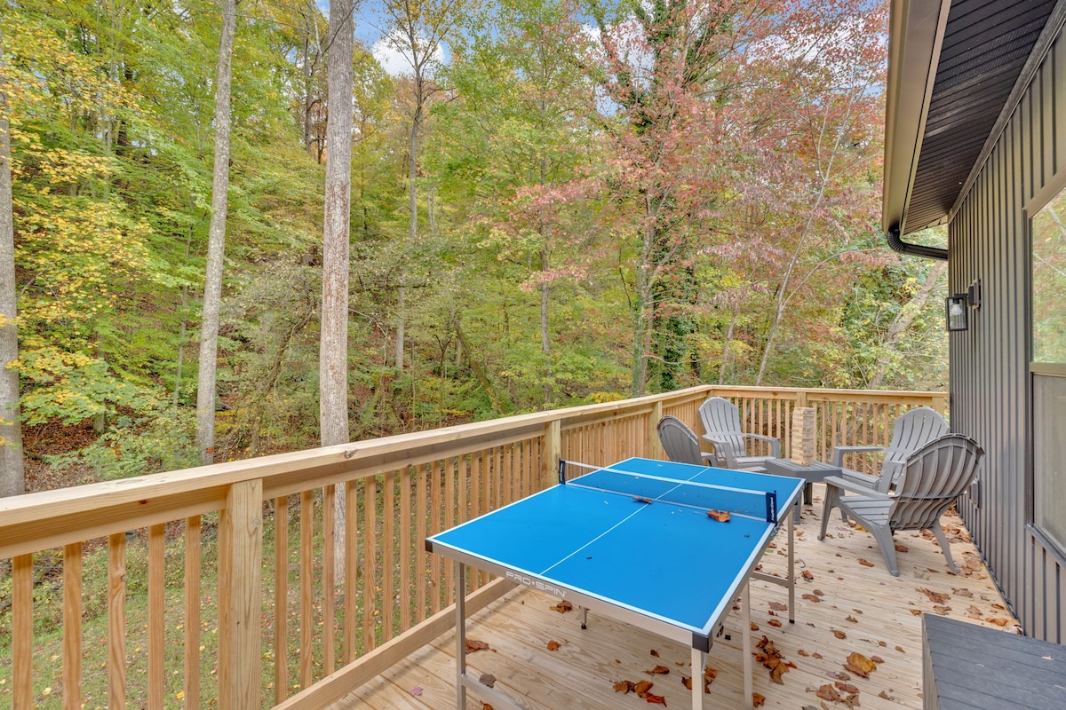 The outside area is just as special! The back deck features a small putting green, Connect 4, Jenga, ping-pong table, and cornhole boards — perfect for family fun or evening relaxation.